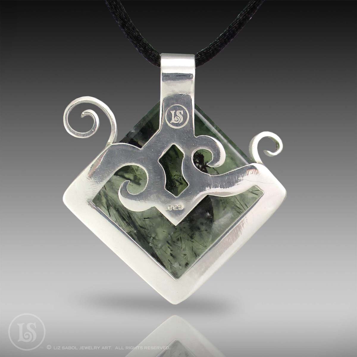 This pendant was inspired by the large central square prehnite stone, and has a unique pierced back.  This one-of-a-kind pendant is crafted in sterling silver and gemstones - prehnite (n) and Chinese Chrysoprase (n).