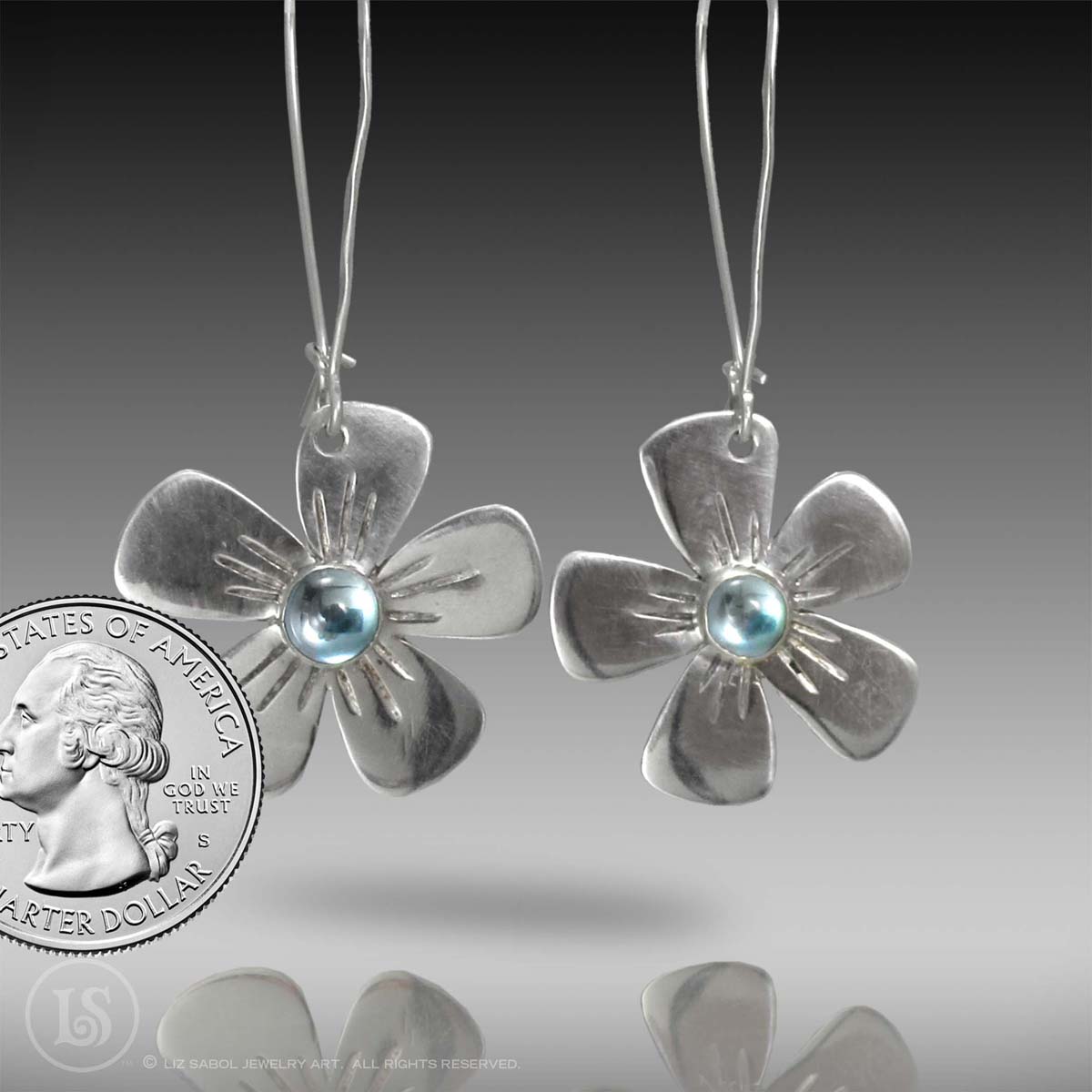 These light-weight earrings are hand-fabricated from sterling sheet.  They feature 6mm swiss blue topaz cabochons.