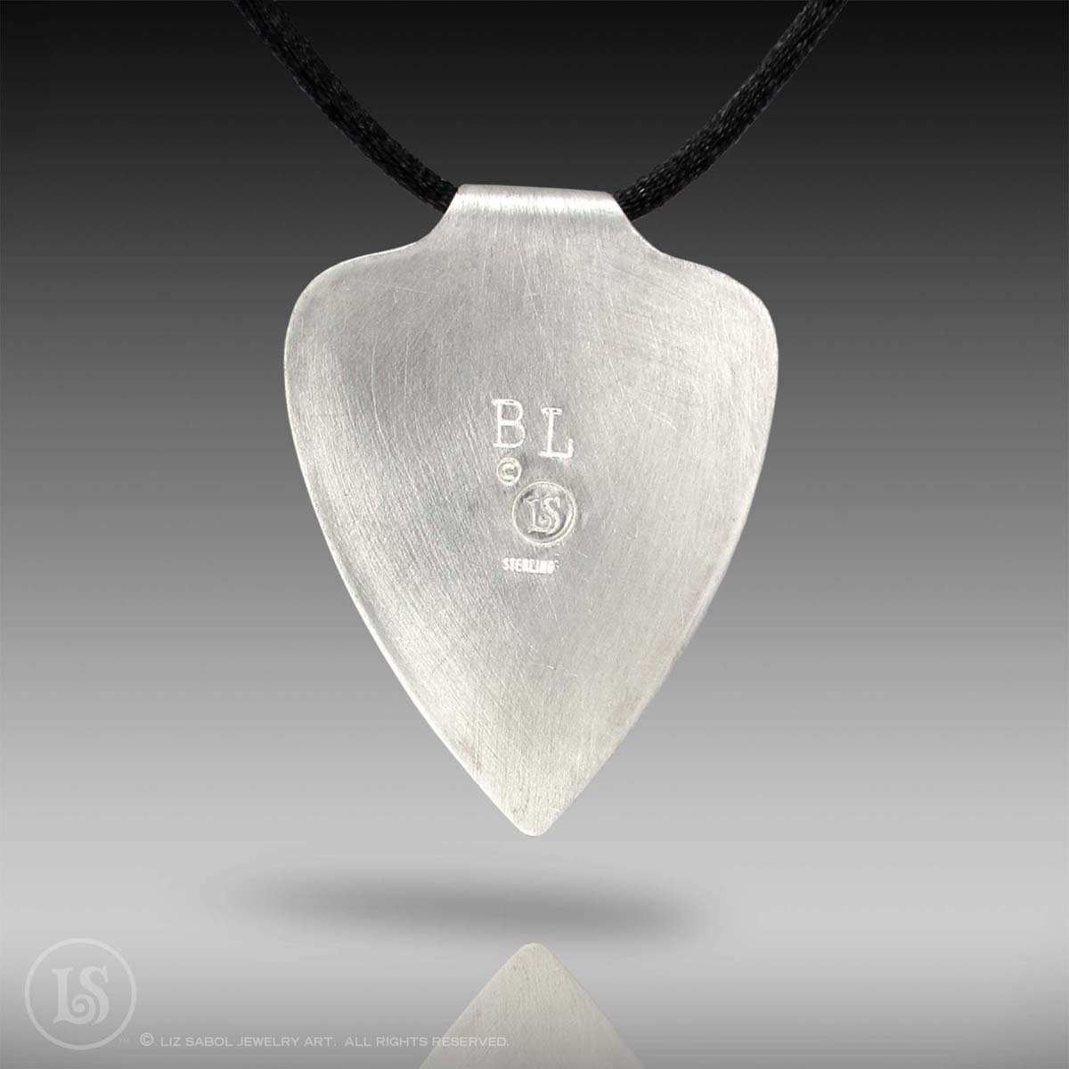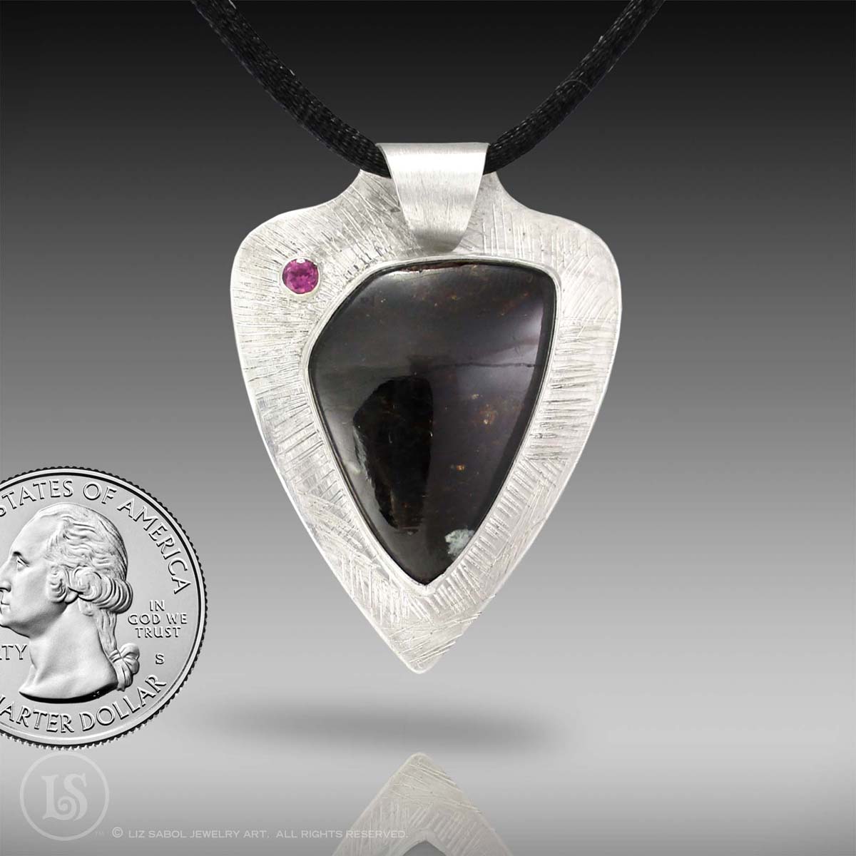 Astrophyllite is a unique and rare gemstone. This stone is very dark, with flashes of cranberry colored light from within. Astrophyllite is thought to direct light into the deepest recesses of your being. This one-of-a-kind pendant is crafted in sterling silver and gemstones - Astrophyllite (n. from Russia) and a faceted Rhodolite Garnet (n). Astrophyllite is a VERY soft stone, 3-4 mohs scale hardness, so should be treated with care. It has some natural horizontal fissures which do not affect the stability of the stone, and should be oiled occasionally to reduce visibility.